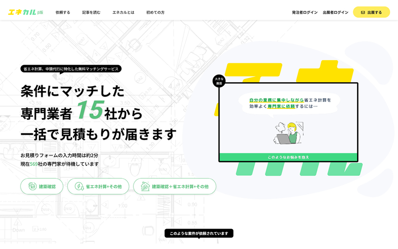 省エネ計算・建築確認申請の専門業者と発注者をつなぐ完全無料のマッチングサービスです。最大15社から一括見積もりが届き、最短一日で見積もりが揃う、クラウドソーシングサービス |