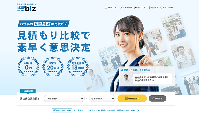 | スピード | 最短1日で最大15社から見積もりが揃うスピード対応 | 見積り依頼後に最大5社から見積もりが届く | 最短1日で見積もりが届く | 「1分アンケートで最適な1社を選定」と掲げており、入力からマッチングまでの対応が迅速 | 「最短当日マッチング」を掲げ、迅速な提案・依頼先選定が可能 |